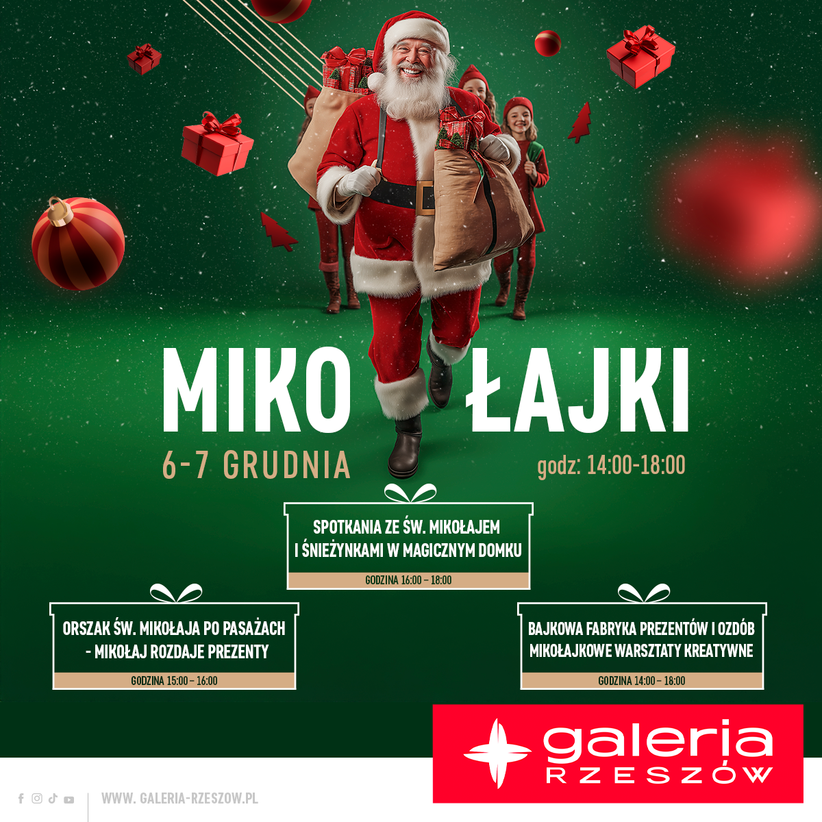 Mikołaj na swoich saniach przejedzie po pasażach Galerii Rzeszów wraz z Orszakiem Elfów, Śnieżynek oraz MEGA Maskotek: Kubusia Puchatka, Psa Pluto, Wilka Soviaka, DevelopRysi, DevelopRysia oraz Wilka Bieszczadzkiego
